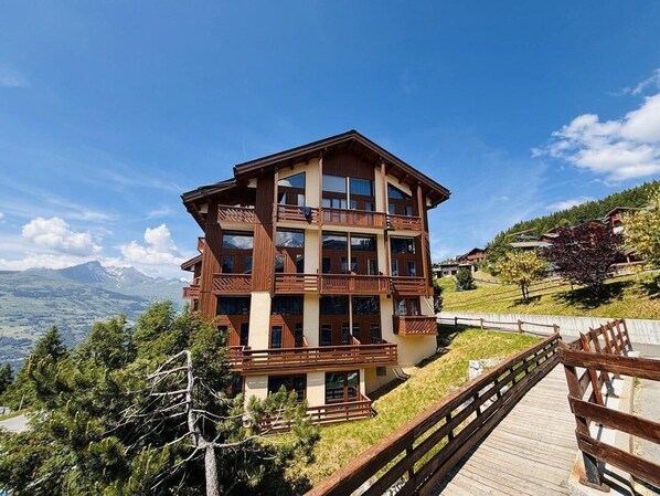 Die Résidence Arc en Ciel befindet sich in idealer Lage im Herzen von Vallandry, einem der fünf Dörfer, die den Ferienort Peisey-Vallandry bilden. Diese Residenz mit Aufzug liegt 50 m von den Pisten und Geschäften entfernt. Vom Gebäude aus bietet sich ein Blick auf die Pisten und das Mont-Blanc-Massiv. Dieses Resort wird Skifahrer aller Niveaus begeistern. Fläche von ungefähr 50 m². 3te Etage. Orientierung : West. Niveau 0 : Wohnzimmer mit Klappschlafcouch (140), Flachbildfernseher. Küche mit Wasserkocher, Kaffeemaschine (filtre), Backofen, Toaster, Geschirrspülmaschine, Mikrowellenherd, Glaskeramikkochfelder. Badezimmer mit Waschmaschine. separates WC. Balkon. Staubsauger. Niveau 1 : 2 Schlafzimmer mit 2 Einzelbetten (80*190). Waschräume mit WC. Niveau 2 : Zwischengeschoss mit Doppelbett (140).