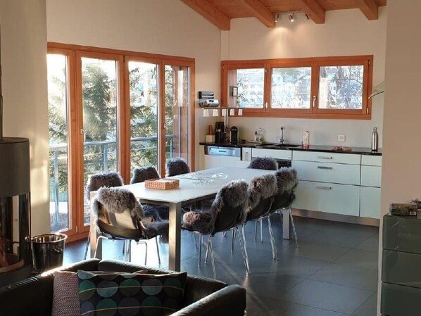 The centrepiece of our house is the comprehensive interior, which leaves nothing to be desired. You will find three comfortable bedrooms on the lower floor - two with double beds and one with a bunk bed, safely protected by a gate. A further bedroom with a double bed and en-suite bathroom is located on the upper floor. The house offers a fully equipped kitchen including a Nespresso machine, dishwasher and raclette and fondue set for cosy evenings. Bed linen and towels are provided as well as a TV, a hairdryer and a Swedish stove for cosy hours.