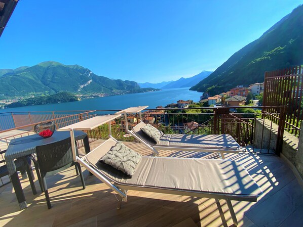 Appartement neuf idéal pour un couple, très romantique avec vue magnifique sur le lac, terrasse privée avec table et chaises, jardin bien entretenu avec chaises longues. Une chambre double confortable avec vue sur le lac
