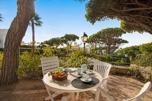 Die Villa Apple ist ein charmantes, zweistöckiges Stadthaus mit 2 Schlafzimmern und herrlichem Meerblick im renommierten Vale do Lobo Resort, nur 15 Minuten vom Flughafen Faro entfernt. In wenigen Gehminuten erreichen Sie den Strand – ideal für Familien oder Paare. Das Haus bietet Platz für bis zu vier Gäste und verfügt über einen offenen Wohn- und Essbereich mit viel Licht, gemütlicher Sitzecke, Kabel-TV und Highspeed-WLAN. Die offene Küche ist mit Toaster, Kaffeemaschine, Mikrowelle, Kühl-/Gefrierschrank, Gasherd und Backofen ausgestattet. Es gibt ein Schlafzimmer mit zwei Einzelbetten und ein Doppelzimmer, beide mit Klimaanlage, ein voll ausgestattetes Bad mit Waschmaschine sowie ein separates Gäste-WC.