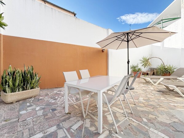 Équipements généraux : TV, wifi, climatisation (chaud et froid), fer à repasser, sèche-cheveux, 60 m2 de logement, patio privé.