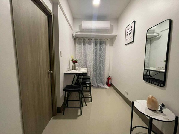 Alle Zimmer bei Cozy 1-bedroom condo with AC and Wifi on the 30th floor, Serene Mandaluyong City verfügen über Aufmerksamkeiten wie eine Klimaanlage sowie Ausstattungsmerkmale wie kostenloses WLAN und Esstische.