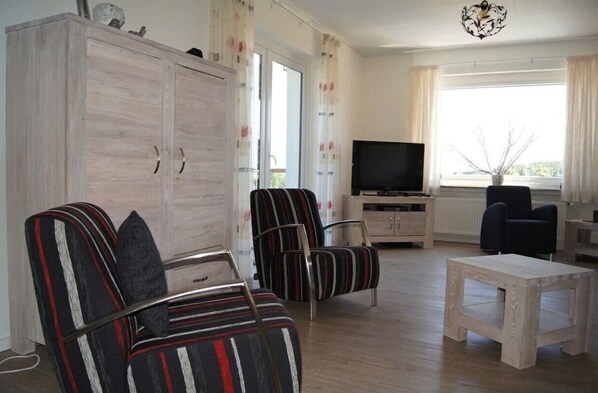Im Erdgeschoß befindet sich das ca. 65m² großzügige Wohn-/Esszimmer mit Zugang zur Außenterrasse. Das Zimmer bietet mehrere Sitzmöglichkeiten, einen LCD Fernseher, einen Schrank mit Gesellschaftsspielen für Groß und Klein.