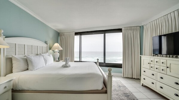 Diese Wohnung am Strand hat alles, was Sie suchen und mehr, einschließlich einer großzügigen Master-Suite mit eigenem Balkon mit Blick auf den Golf von Mexiko! Diese Suite mit kühlem Dekor, Kingsize-Bett, eleganter ebenerdiger Dusche und Granitoberflächen in der Badewanne ist ganz nach Ihren Wünschen eingerichtet.