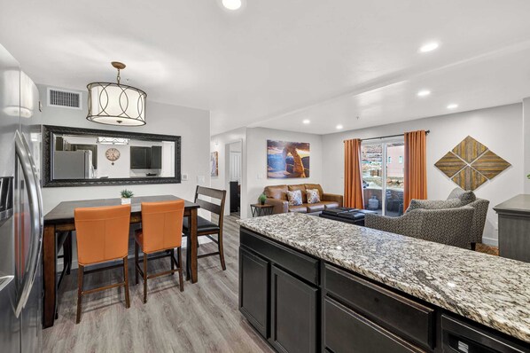 We were not very happy with our stay in this condo, and should have read the reviews a bit more. All of the poor reviews are valid, and the pictures on Vrbo do not match the condition of this unit. We arrived to a full dishwasher, and wet laundry in both the washer and dryer. The place is in need of a deep clean, new couch, carpet, beds and bedding (we ended up using the quilts from extra bedroom to cover the couch for sitting on). I am assuming it is the management company that handles all of this? I did ask, and got no response. Communication was ok, Tyler is good with standard, but not answering questions. Haley did come to our help when the door lock broke, battery needed. She was very helpful and nice, we were very grateful and hot after a long day. Our additions to issues, would be the Air conditioner - extremely loud, also the return on the floor very dirty. Tubs have issues draining. A large bug was fund in our friends bed. Lights not working in bedrooms, shelfs still missing from Frig. TV remote / internet OK ish. In the listing sleeping 10 would be tough, as 2 would have to sleep on the pull out from couch, and a mattress in closed for one of the twin beds. There was only 4 in our group plus pups, so OK for us. The pool and location were great, close to Moab and National Parks. There were some positive in unit, kitchen stocked, clean shelves. Layout of unit. Really just needs some attention.