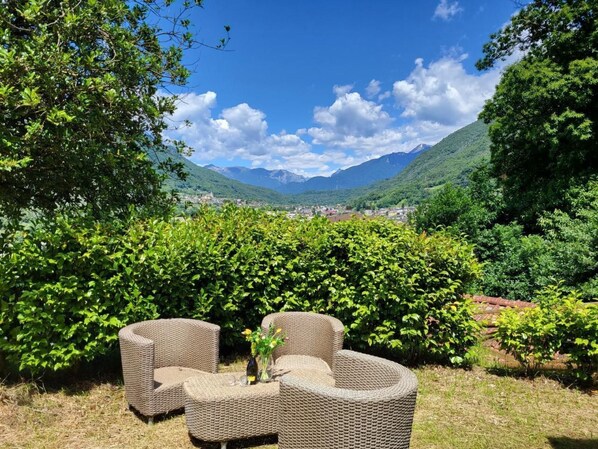 Der Außenbereich des Rusticos hält eine eindrucksvolle, überdachte Terrasse und einen großzügigen, direkt am Haus gelegenen Garten (nicht eingezäunt) für Sie bereit. Von Ihrem privaten Parkplatz, der maximal zwei Autos Platz bietet und nach einem kurzen, steilen Fußweg zum Rustico führt, können Sie die Ruhe und Schönheit der Tessiner Landschaft in vollen Zügen genießen. Auch für das Ent- und Beladen stehen Sie nur circa 50 Meter vom Rustico entfernt.