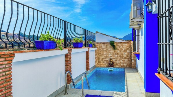 Auf der Außenterrasse finden wir den Pool, ein perfekter Ort, um ein Bad zu nehmen und sich zu sonnen.