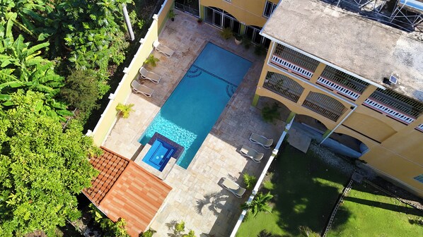 Charming Peach Retreat: Cozy Twin Beds with Poolside Views in Montego Bay