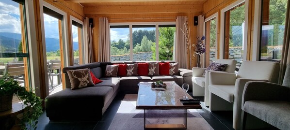 Vom Wohnzimmer aus haben Sie direkten Zugang zu einer geräumigen Außenterrasse mit eigenem Außenwhirlpool.