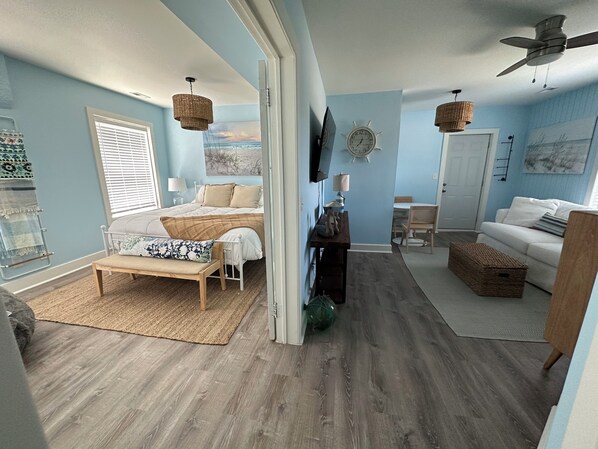 The unit lacks functionality. Dining table in way of door. Washing machine during spin cycle “walked” and sounded like a plane taking off. Things on top fell off because of movement. No dishwasher. Should include instructions for tv’s. Size of tv in bedroom was way too big. The unit needs more room to put your things. We used the kitchen island and living room tv stand (or the floor) for our things since the unit was lacking storage. The outside stairs were metal with grips. For the unit being advertised as dog friendly, the stairs were not! Also, if one is sensitive to equilibrium issues, be aware the floors are extremely uneven! One in our party was frequently holding on to walls or furniture because the floors were so even.