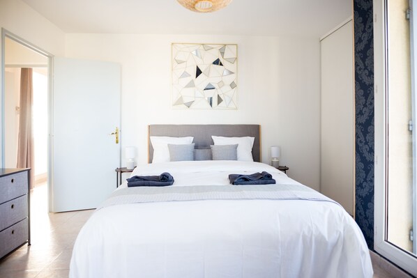 Ein großes Schlafzimmer für 160 * 200 cm, schöne Bettwäsche.