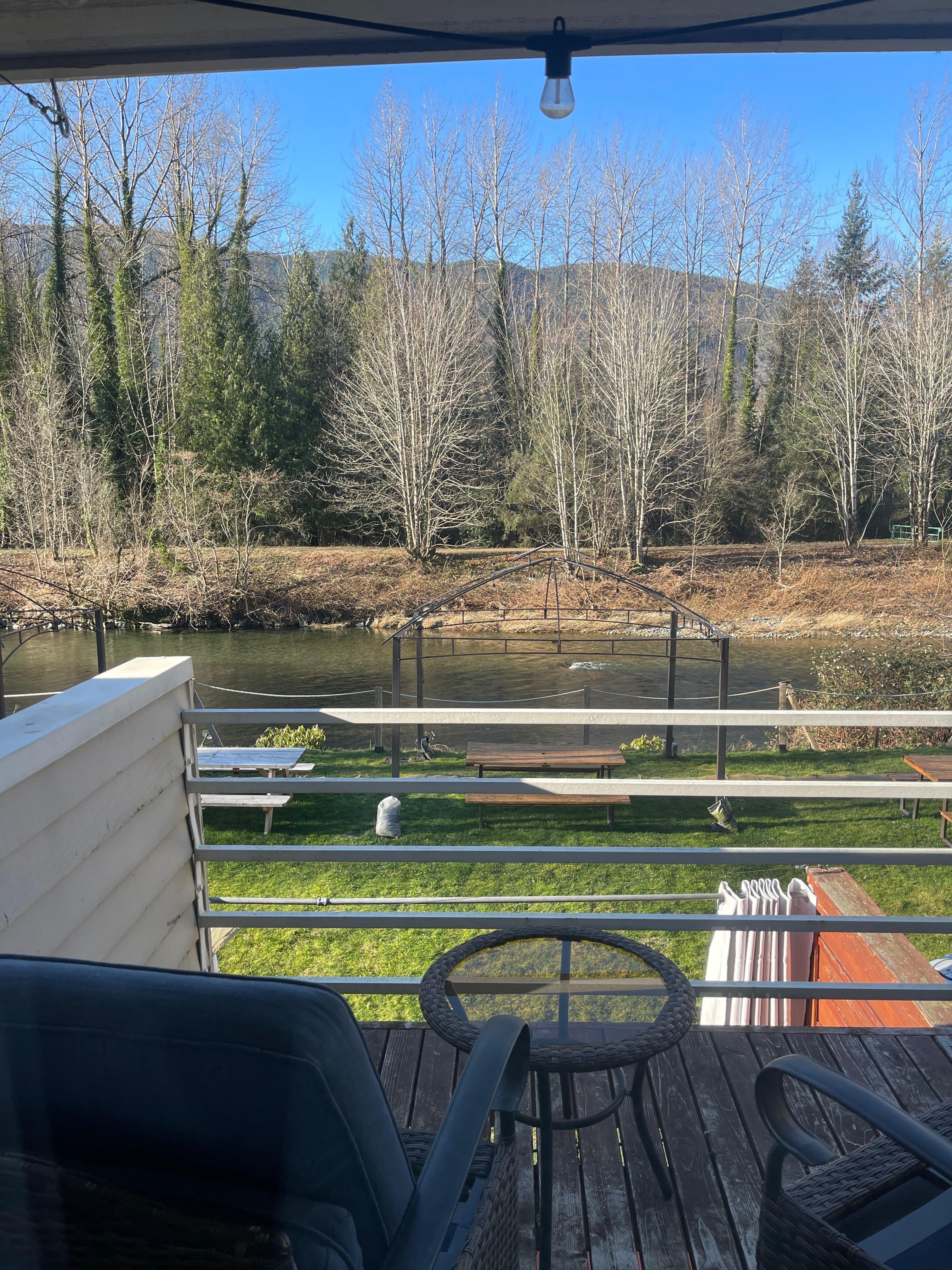 2 chambres, salle de bain complète, TV dans chaque chambre, la chambre principale a une terrasse privée avec terrasse et vue sur la rivi��re.