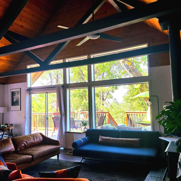 2 Br 2 Ba upstairs in cabin w/hot tub on 5.6 acre. Next to a Creek /near a lake
