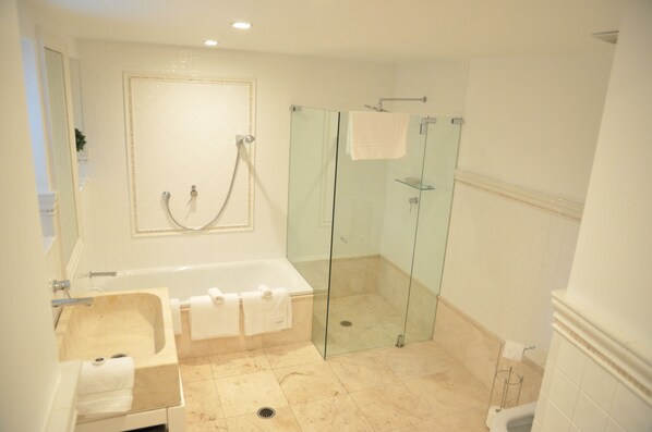 Zur Badausstattung gehört Folgendes: Duschen.