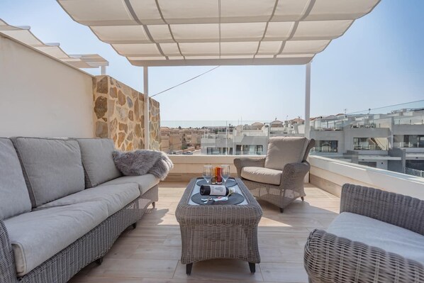 Dach-Solarium mit Lounge-Gruppe und Pergola.