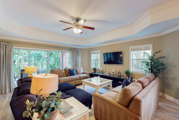 Geräumiger, komfortabler Sitzbereich mit zwei Sofas und zwei Akzentstühlen zur privaten Terrasse