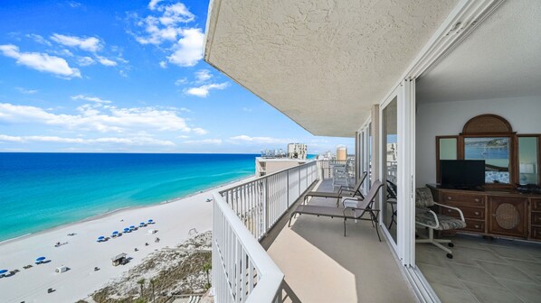 E1501 ist eine voll ausgestattete geräumige 1975 sq. Ft. Drei Schlafzimmer-Einheit, die bis zu zehn Gäste beherbergt. Alle Zimmer verfügen über raumhohe Glas- und Glasschiebetüren mit Blick auf den Golf für eine großartige Aussicht von innen oder von dem etwa 60 Fuß langen Balkon, auf dem Regal- und Hochstühle, Tische und eine Liege stehen. Das Wohnzimmer verfügt über einen Flachbild-TV / Kabel, Videorekorder, DVD, Stereoanlage, Liebessitz, Sofa ausziehen Queen-Size-Schläfer und eine übergroße Schwenk / Rocker Liege. Der Essbereich umfasst einen Tisch für sechs Personen und eine Bar für drei Personen. Die renovierte Küche ist komplett ausgestattet und ungewöhnlich gut mit Kochen, Essen und unterhaltsamen Waren bestückt, hat viel Ablagefläche, zwei Mikrowellen, ein Glas-Top-Herd und eine Seite nebeneinander Kühl- / Gefrierschrank. Die Master-Schlafzimmer-Suite verfügt über ein Kingsize-Bett, einen Flachbild-TV / Kabel-und DVD-Player und einen Segelflugstuhl. Neben dem Master-Bad, das mit einer großen ADA-konformen begehbaren Dusche mit umklappbarem Sitz und Haltegriffen ausgestattet ist, gibt es einen separaten Ankleidebereich mit Spüle, Ablagefläche, Schubladen usw. Das zweite Schlafzimmer verfügt über ein Queensize-Bett, einen Flachbild-TV, eine Wippe / Sessel und einen zusätzlichen Stuhl. Das dritte Schlafzimmer hat ein Queen-Size-Bett und ein Doppelbett, einen Flachbild-TV, einen Stuhl und einen eigenen kleinen privaten Balkon mit zwei Stühlen und einem kleinen Tisch. Das Gäste-WC hat eine Badewanne / Dusche-Kombination. Die Unterkunft verfügt über eine große Waschmaschine und einen Trockner.