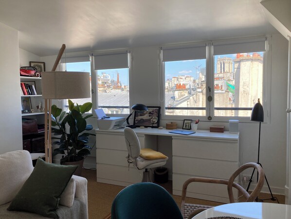 What a charming and cozy apartment! The rooms were flooded with light - on some days we could even enjoy the colours of the sunrise over Notre Dame Cathedral. The Seine is right around the corner - taking walks along the river is so inspiring. It was so nice to be warmly welcomed in person by our friendly host Jean-Paul. He gave us a tour around the apartment including the beautiful roof-top terrace and explained everything we had to know. The apartment is perfectly equiped. The elevator makes it easily accessible with luggage. Shopping can be done very conveniently in the neighbourhood. My husband and I spent 1.5 weeks in Paris and we found it very practical that you can reach many of the Paris sites by walking. We also used the Velib rental bikes a lot. Also the Metro station is only a 3 minute walk away. We thoroughly enjoyed our stay in Jean-Paul’s apartment and hopefully can come back. Thank you so much!!!