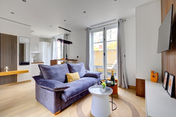 Le séjour propose un espace salon convivial avec un canapé-lit double, table à manger et télévision parfait pour se détendre après une journée de visites ou partager un moment à plusieurs.