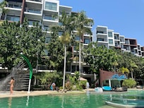 bel hôtel coupé de la plage par un autre resort.