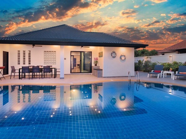 Art d. Gebäudes: Bungalow. Grundstücksfläche: 500m². Baujahr: 1998. Diese Villa mit privatem Pool und Jacuzzi ist nur wenige Minuten vom geschäftigen Pattaya mit seinen Einkaufszentren, dem pulsierenden Nachtleben und den schönen Stränden entfernt.