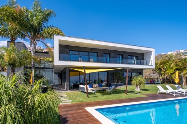 Ein modernes und luxuriöses Anwesen mit einem Außenpool, inmitten eines Gartens mit einem atemberaubenden Blick über den Atlantischen Ozean.