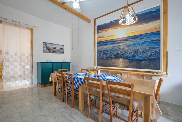 Der Außenbereich bietet eine schöne Terrasse mit einem Essbereich im Freien, ideal für Mahlzeiten im Freien an der frischen Seeluft.