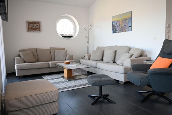 Die stilvolle 3-Raum Ferienwohnung für 4 Personen bietet auf ca. 117m² einen sehr großen, hellen Wohnbereich mit Fliesenboden, Sofaecke, Kamin, Essecke und offener, voll ausgestatteter Küche. Direkt vom Wohnbereich aus gelangen Sie auf die großzügige Terrasse. Genießen Sie den schönem Blick auf den Hafen von Lauterbach und die Insel Vilm.
