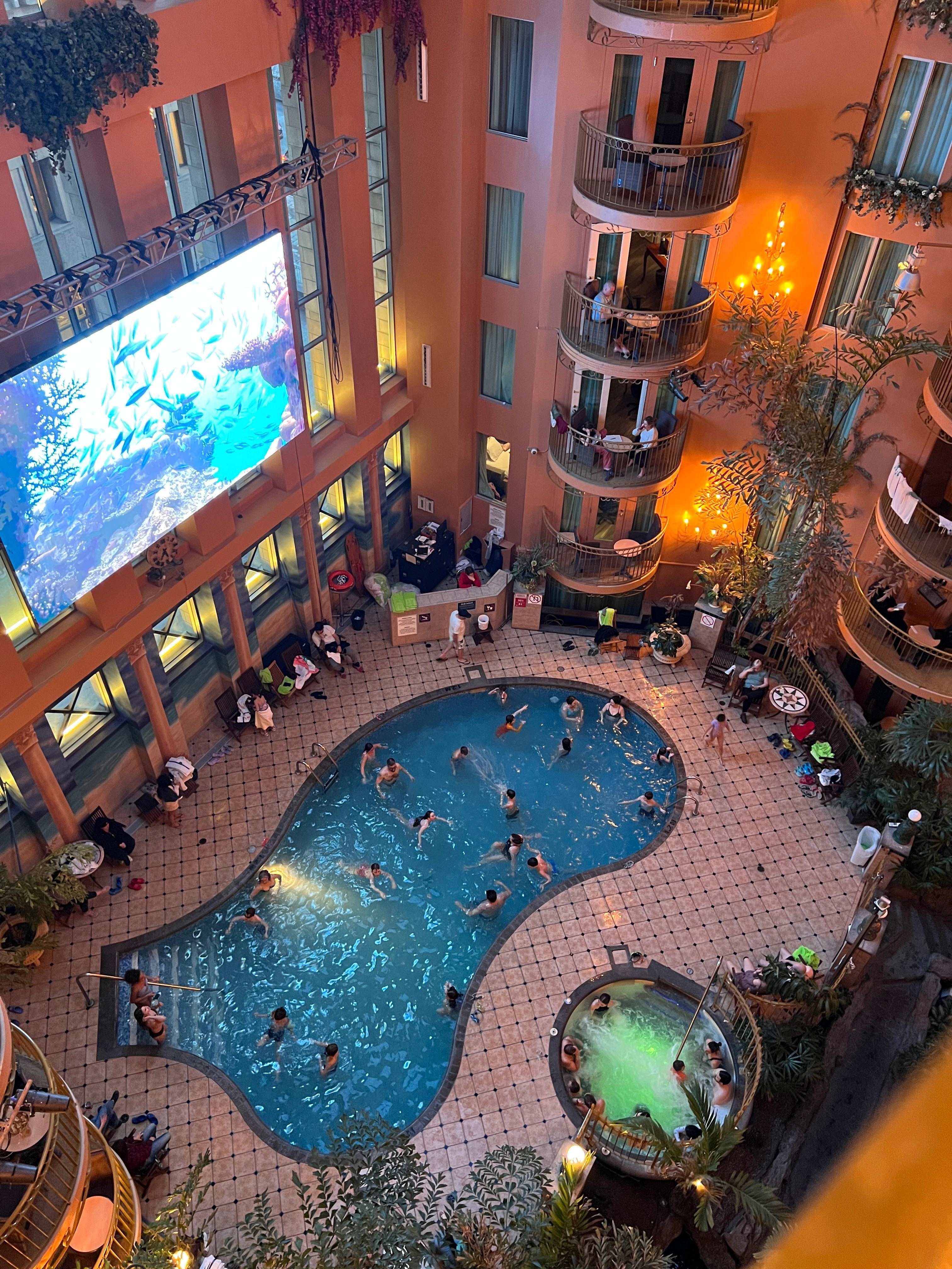 Un ascenseur sur trois fonctionnait et parfois aucun. Des clients y sont même restés coincés. L’espace de la piscine intérieur est climatisé de sorte qu’il fait un peu frais pour se baigner dans la piscine et que les gens se réchauffent dans le jacuzzi, alors que la température extérieure était de >30•C. Nous sommes allé une seule fois au restaurant pour le petit déjeuner et avons trouvé la nourriture de basse qualité. Le personnel était par contre très gentil et l’hôtel très bien placé.