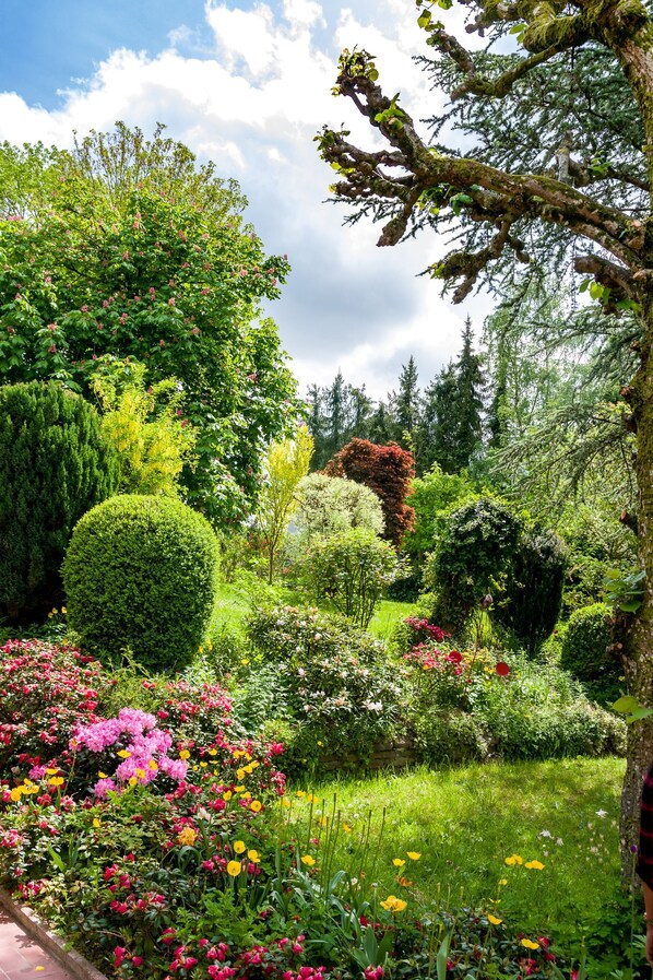 Das Haus liegt in einem wundervollen, großen, parkähnlichen Garten mit überdachter Terrasse, Gartensitzplatz unter großen Bäumen mit Gartengrill und div. Spielgeräten für die Kinder. Nebenan grasen die Schafe....