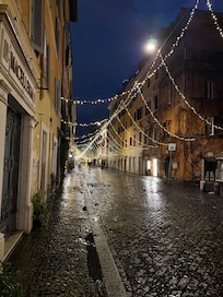 This apartment is is a village type neighborhood ver close to the Vatican. It has restaurants and shopping on the ground level. Christmas season the village was decorated with light and was very charming and heartwarming . Loved this area.