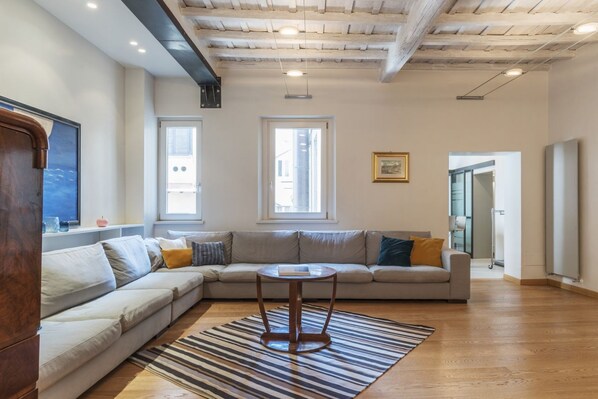 This huge and modern 195sqm apartment can accommodate up to 7 people. Located on the third floor, with lift (not suitable for disabled people), of a renovated period building close to Piazza Navona (6 minutes on foot), the apartment is ideally located fo