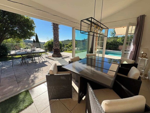 - Een lichte woon-eetkamer met bank, een ruime, volledig uitgeruste keuken met toegang tot een terras bij het zwembad.