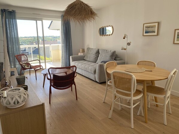 L'arrivée ne fut pas chose aisée, car l'agence de location est située dans une rue très commerçante, et où il est difficile de se garer. Et le GPS ne parvenait pas à nous amener jusqu'au parking de la résidence. Les explications de l'agence nous ont été utiles, mais ce parking est très difficile d'accès, surtout avec une remorque à vélo. Mais une fois sur place, le logement était conforme à l'annonce. La vue est très agréable, manger sur le balcon est un luxe, la décoration est très sympa, le canapé de grande qualité (pas fréquent), les lits également.Le coin cuisine est petit, mais suffisant pour des vacances, et les équipements (micro-onde, table de cuisson, lave-vaisselle) sont de qualité. Il manquait peut-être quelques couverts et ustensiles de cuisine, obligeant à utiliser le lave-vaisselle quotidiennement (alors que nous n'étions que 3).La résidence a fait le choix de ne pas disposer de collecteur de déchets, et il faut donc partir en chasse dans le village, ce qui n'est pas impossible mais fastidieux.Nous avons tout de même passé un excellent séjour à Saint-Cast, avec cette plage quasiment aux pieds de la résidence (ça grimpe quand même fortement le soir !), un quartier avec des maisons magnifiques, la plage de Mar à 10 mn à pied à peine, et ces lieux à visiter tout autour (Le chateau du Guildo, celui de Fort Lalatte, St Jacut de la mer, St Malo...).