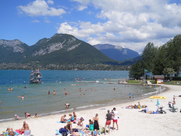STRAND: Entspannen Sie im Schatten der hohen Bäume, spielen Sie eine Partie Volleyball oder Pétanque oder spielen Sie eine Partie Sprungbrett, Pontons, Planschbecken und Spiele für Kinder. Duschen und Toiletten. Snackbar und Restaurant vor Ort. Eine Rampe und schwimmende Liegen stehen Personen mit eingeschränkter Mobilität kostenlos zur Verfügung, um den Zugang zum Wasser zu erleichtern. Kleine Eintrittsgebühr für Strand Juli / August (9.30 - 17.30 Uhr), die von Rettungsschwimmern überwacht wird.