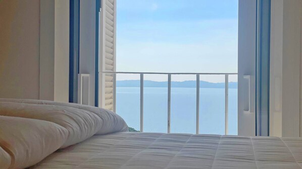 - Chambre 2 climatisée avec lit double 160cm (aussi vue mer en étant allongé !), télévision, placards, et salle d'eau en suite : douche, meuble vasque, sèche serviettes