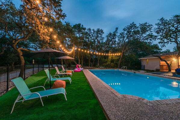 Ich kann es Ihnen nicht vorwerfen, dass Sie den größten Teil Ihres Urlaubs in diesem Haus verbringen möchten. Lehnen Sie Ihre müden Beine auf dem Sofa oder den Sesseln ab, während Sie im Wohnzimmer auf den Flachbildfernseher schauen. Entspannen Sie auf der hinteren Terrasse und dem eingezäunten Rasen oder setzen Sie sich auf die Schaukel auf der Veranda. Genießen Sie die Privatsphäre des riesigen Hinterhofs mit reifen Texas Oaks und Pecan Trees. Spielen Sie lustige Spiele im gut ausgestatteten Spielzimmer. Springen Sie in Ihren privaten Pool oder sitzen Sie mit Ihrer Familie oder Freunden zusammen und beobachten Sie das Mondlicht, und vergessen Sie nicht den professionellen Grill, der nur auf Sie wartet. Ich kann Ihnen versichern, dass Sie es lieben werden!