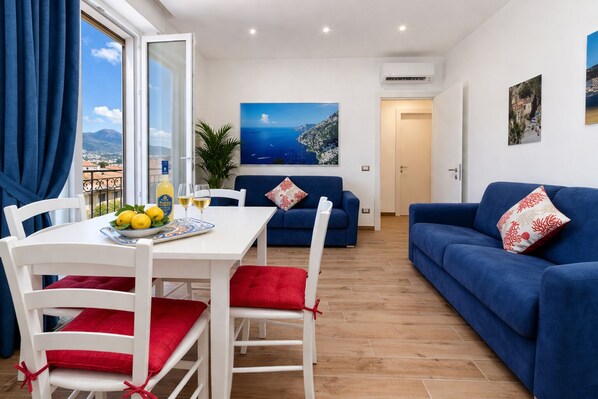 Im Wohnzimmer, ebenfalls mit Smart-TV und Klimaanlage, befinden sich zwei Schlafsofas. Das Wohnzimmer öffnet sich zur Terrasse mit Tisch und Stühlen.