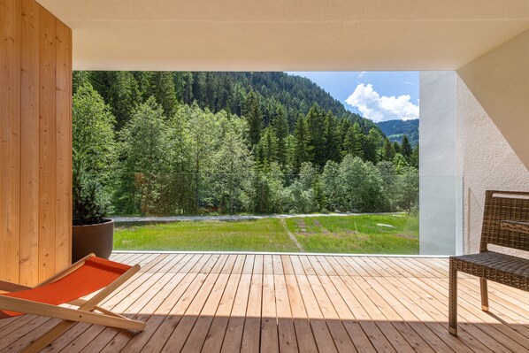 Die charmante Terrasse bietet die Möglichkeit, sich zu entspannen, während Sie die reine Dolomitenluft atmen und dem sanften Rauschen des angrenzenden Gebirgsbachs lauschen.