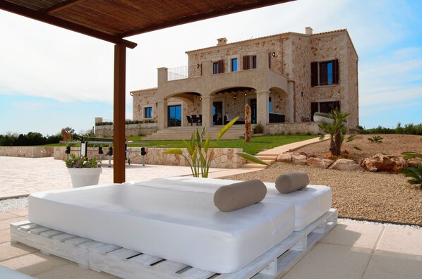 - Infinity-Pool (10 x 5 m, 1,80 m tief) mit integriertem Kinderbereich, abgetrennt durch eine Edelstahlbarriere. Umgeben von Liegestühlen, Garten und Chill-out-Zone.