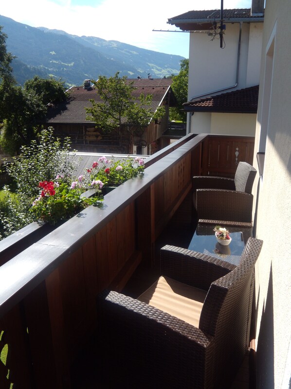 Im Eingangsbereich aus hellem Eschenholz findet sich eine Garderobe, ein Schrank mit Safe und ein weiteres WC. Westseitig befindet sich ein großer möblierter Balkon mit bequemen Lounge-Möbeln und Blick auf die umliegenden Berge und in das dörfliche Geschehen.