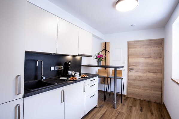 Unsere Ein-Zimmer-Ferienwohnungen der Kategorie 32 m² sind Nichtraucherwohnungen und verfügen über ein Doppelbett oder französisches Bett, eine Küchenzeile mit 2-Platten-Induktionsherd, teilw. Balkon, Dusche/WC, SAT-TV-Flatscreen und W-LAN.