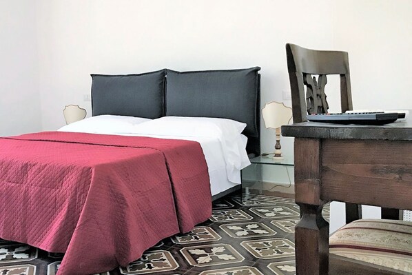 Das Schlafzimmer ist gut gepflegt und mit einem Kingsize-Bett, einem flachen Fernseher und einer Klimaanlage ausgestattet.