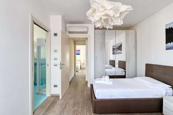 Es ist in einem modernen und eleganten Stil eingerichtet und verfügt über ein großes Doppelbett mit einer bequemen Matratze und doppelten Memory-Schaum-Kissen, ideal für ein entspanntes Aufwachen.