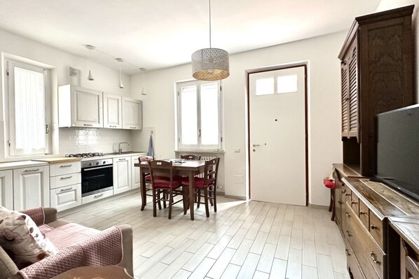 Description : ground floor. Living room with single sofa bed, dining table and new kitchenette - double bedroom - bathroom with shower and washing machine - large terrace equipped with table and chairs where you can eat.