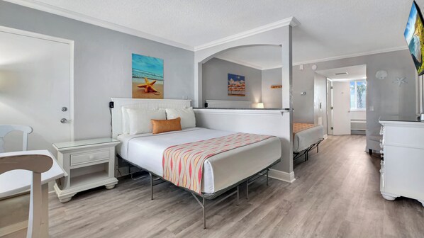 Unsere Standardeinheit ist ein Paradies für Menschenbeobachter. Ein Blick auf den Pool und all seine Aktivitäten. Dieses Zimmer verfügt über ein Queensize-Bett, 30 m² Wohnfläche, ein eigenes Bad mit Handtüchern und Pflegeprodukten, eine Küchenzeile und einen Flachbild-TV. Der separate Wohnbereich verfügt über einen großen Futon- und Essbereich. Gemeinsamer Außenbalkon mit Sitzgelegenheiten für zwei Personen. Platz für bis zu 4 Gäste. Das Personal vor Ort bietet einen täglichen Reinigungsservice, damit Sie sich zurücklehnen und entspannen können!