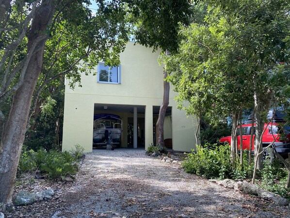 A very spacious and clean stilted house accessible via a 20-step stairway. The open ground floor is a nicely shaded carport. The house is well appointed with all necessities. The key-pad operated door lock is very easy to use. The house has a nicely decorated interior and a large balcony with roof. It is a very comfortable house to spend time in. The house is located in a quiet neighborhood and is a 5-min walk to the Harry Harris Park, a good place to walk our dog and sample the ocean breeze. The house is surrounded by large mature trees, hence very shaded, conveying a sense of living in the forest with its complement of wildlife including wild birds and two very large resident iguanas, the larger one we named Iggy! The backyard is unusable as it is unmanaged, covered by leaves and bushes, and a sand pit frequented by flying insects. We and our dog didn’t use the backyard. On the whole we have very much enjoyed staying in this property.