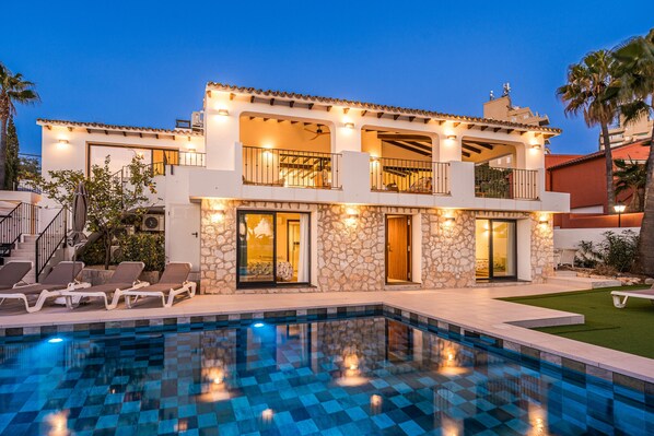 Diese unglaubliche Villa wurde mit akribischen Updates und Renovierungen nach höchsten Standards mit stilvollem Dekor versehen. Die Villa verfügt über einen einladenden Loungebereich mit einem zusätzlichen Esstisch sowie eine neu ausgestattete Küche, die perfekt zum Dekor passt. Alle diese Bereiche genießen den Meerblick auf Calpe. Es gibt 5 großzügig geschnittene Schlafzimmer auf zwei Etagen, 3 x King-Schlafzimmer (2 x mit Badezimmer en Suite) und 2 Schlafzimmer, beide mit Einzelbetten (1 x mit Badezimmer en Suite). Alle Schlafzimmer sind vollständig klimatisiert.