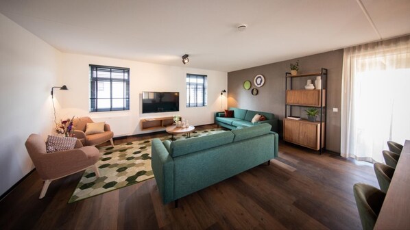 Das Haus verfügt über ein geräumiges und helles Wohnzimmer mit einer Sitz- und Essecke und einem Fernseher. mit Chromecast. Die luxuriöse offene Küche ist mit einem Kühlschrank mit Gefrierfach, einer 4-Flammen-Induktionsplatte, einer Filterkaffeemaschine & eine Kapsel-Kaffeemaschine, einem Wasserkocher, einem Geschirrspüler und einem Kombiofen mit Mikrowelle ausgestattet.