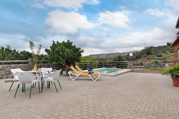 Die Finca verfügt über einen privaten Außenbereich mit Pool, Garten, Gartenmöbeln, offener Terrasse, überdachter Terrasse, Grill und Außendusche.